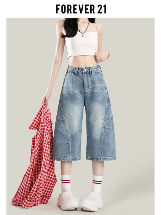 Forever 21覆古浅蓝高腰牛仔短裤女阔腿七分裤宽松直筒弯刀中裤子