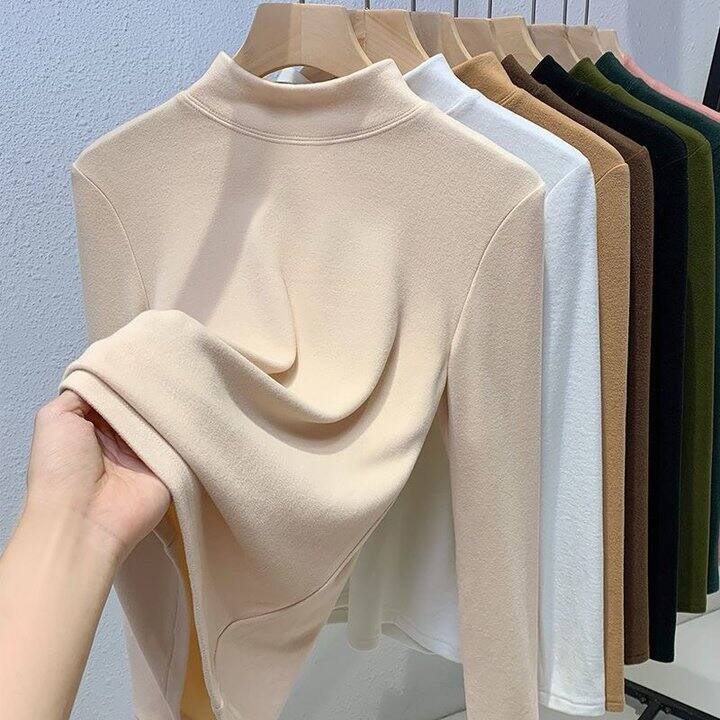 德绒保暖打底衫女秋冬白色内搭小立领长袖t恤半高领修身上衣秋衣