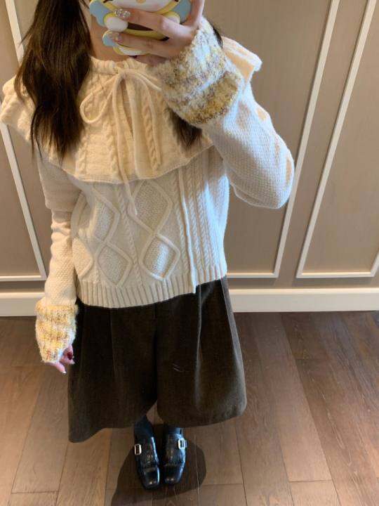 白色短款麻花毛衣女灯笼袖慵懒风秋冬新款韩版宽松加厚套头针织衫