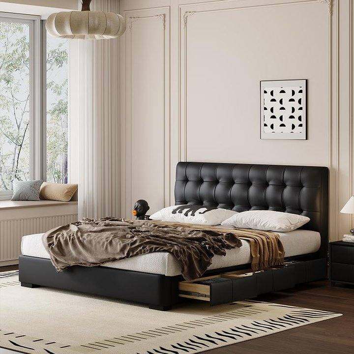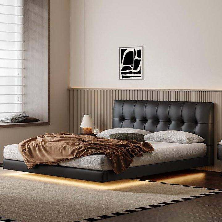 意式极简黑色悬浮真皮床现代小户型主卧齐边双人床复古风悬空床