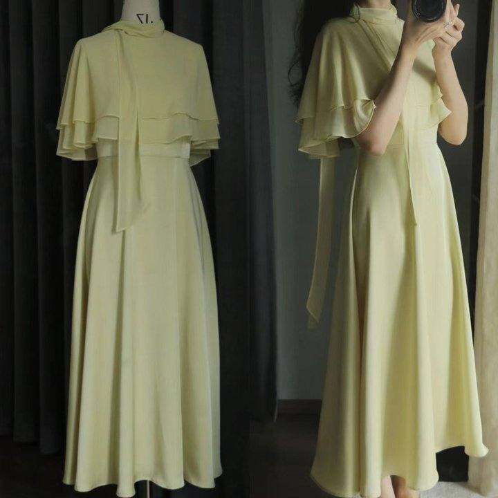 小泽一木 原创 淡黄月 通勤气质优雅中长款收腰飘带领连衣裙