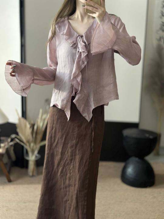 半自由春夏新款气质系带慵懒风衬衫宽松显瘦法式V领小众上衣