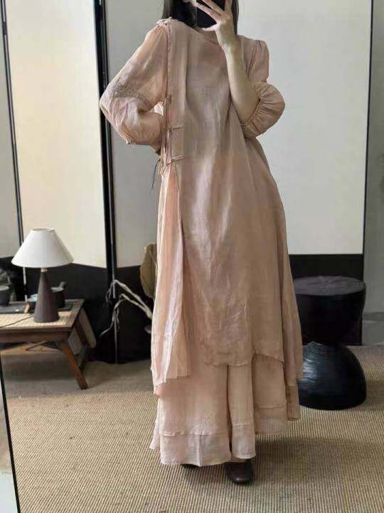 夏季新款品质苎麻手工盘扣花边系带国风连衣裙双层半裙套装