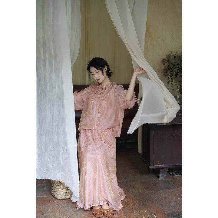 已收到。同样是麻料,实物上身真的比图片好看多了。买的粉色,巨温柔,黄皮完全可以。半裙很好,单穿也很百搭,透气又飘逸,完全不会闷。官搭显得人又瘦又温柔,外衫是圆领,带点俏皮感,一套两百多的价格真的超值。