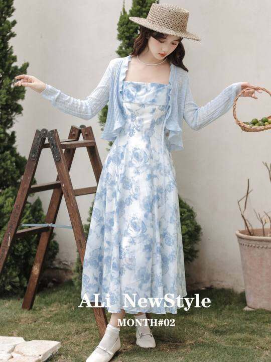 【新品折扣】蓝色方领吊带连衣裙外搭开衫两件套海边度假沙滩裙春