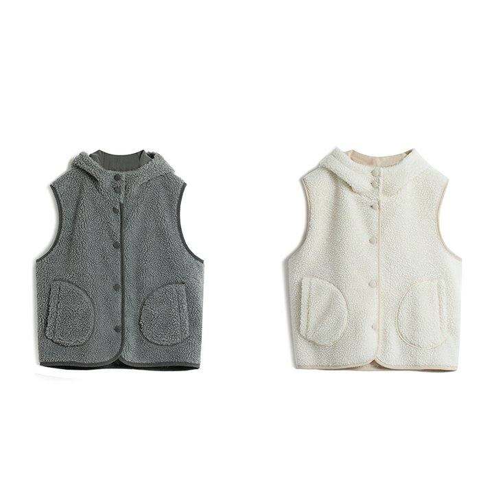 外羊羔绒内灯芯绒·灯芯绒包扣·口袋连帽马甲·保暖无袖厚外套冬