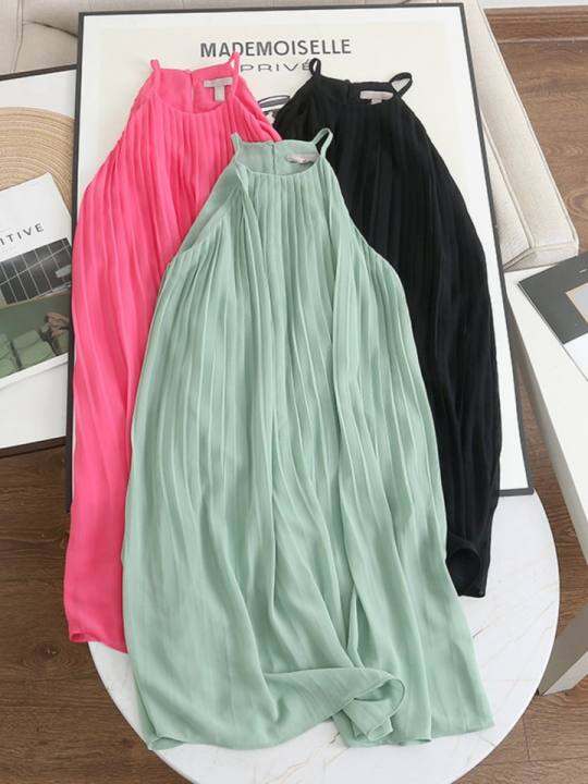 度假风纯色宽松风琴百褶雪纺吊带挂脖无袖女中长款连衣裙