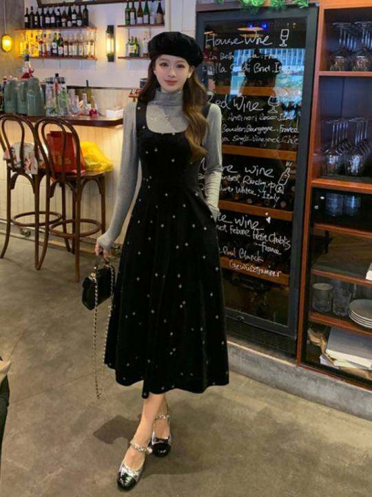 大码法式细闪丝绒吊带连衣裙女秋冬高腰A字百褶裙子胖mm气质长裙