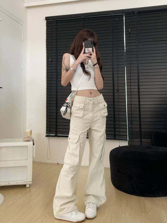 美式复古白色工装裤女春季新款直筒宽松阔腿高腰显瘦休闲牛仔裤子