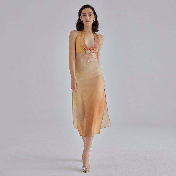 Silk Maison挂脖真丝印染连衣裙女夏季气质露背桑蚕丝中长款裙子