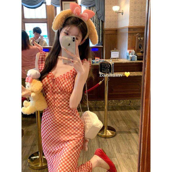 白水女【熟樱桃~】红色格子吊带鱼尾裙女法式温柔海边度假洋装