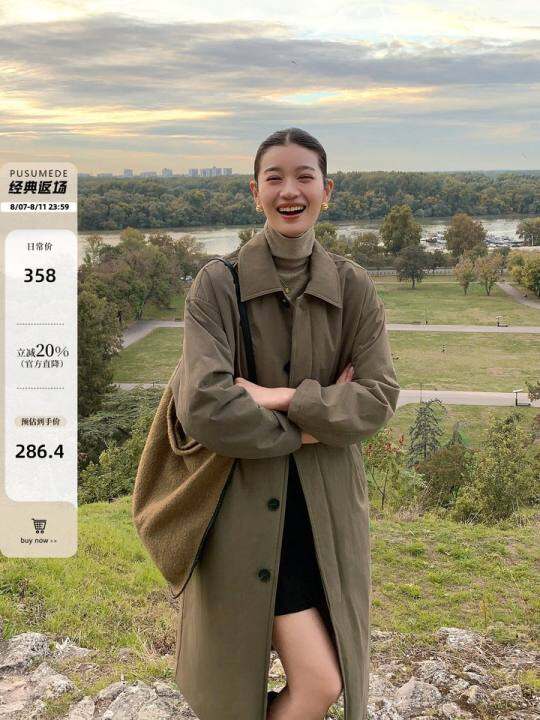 pusumede翻领中长款夹棉风衣外套女秋冬新款收腰宽松休闲棉服大衣