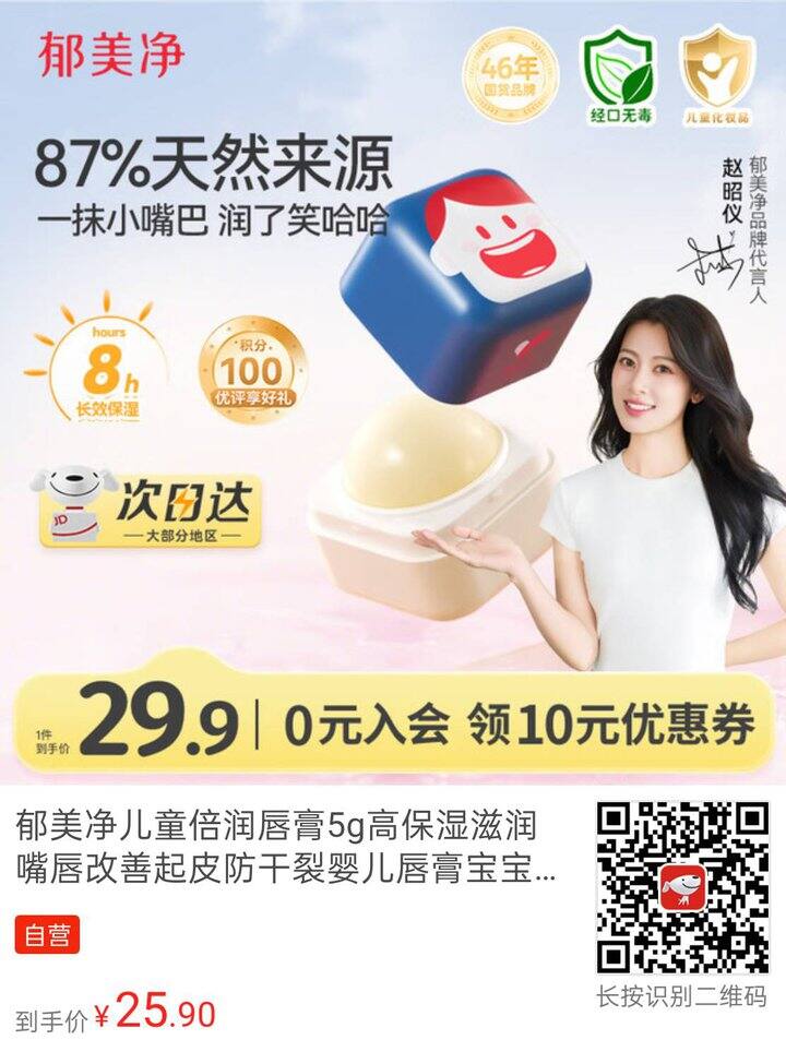 【京东】郁美净儿童倍润唇膏5g高保湿滋润嘴唇改善起皮防干裂婴儿唇膏宝宝唇膏