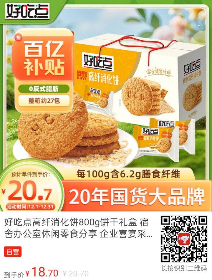 【京东】好吃点高纤消化饼800g饼干礼盒 宿舍办公室休闲零食分享 企业喜宴采购