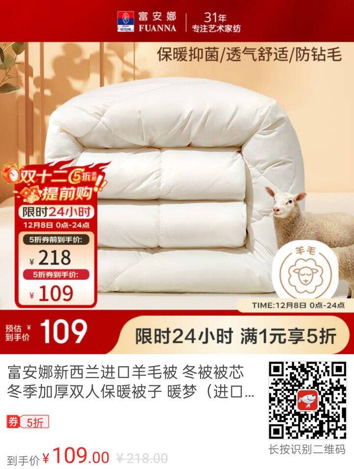 【京东】富安娜新西兰进口羊毛被 冬被被芯冬季加厚双人保暖被子 暖梦(进口新西兰羊毛抗菌冬被) 1.2米床/单人(被芯152*210cm)