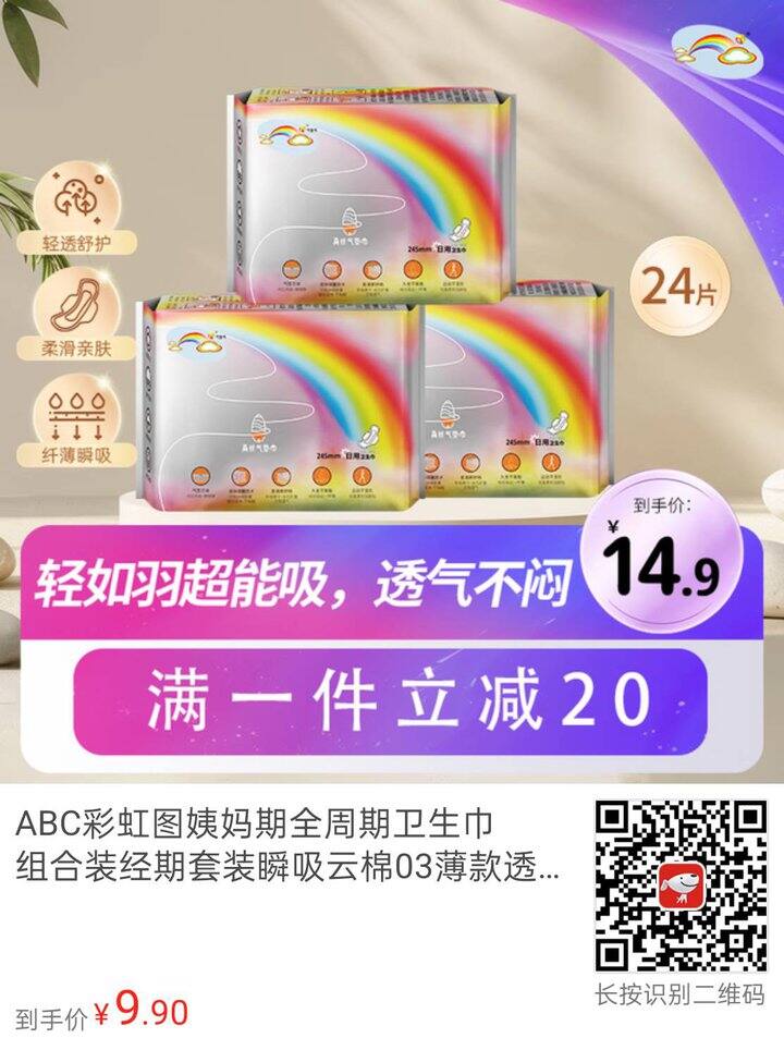 【京东】ABC彩虹图姨妈期全周期卫生巾组合装经期套装瞬吸云棉03薄款透气棉柔 【健康配方】日用套装245mm*24片