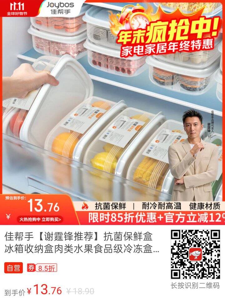【京东】佳帮手【谢霆锋推荐】抗菌保鲜盒冰箱收纳盒肉类水果食品级冷冻盒2.5L