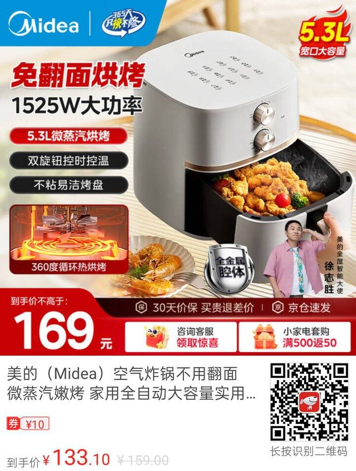 【京东】美的(Midea)空气炸锅不用翻面 微蒸汽嫩烤 家用全自动大容量实用 多功能炸锅金属腔体不沾易洗 炸烤箱一体 【店内排名第一|双旋免翻面】505P6- 5.3L