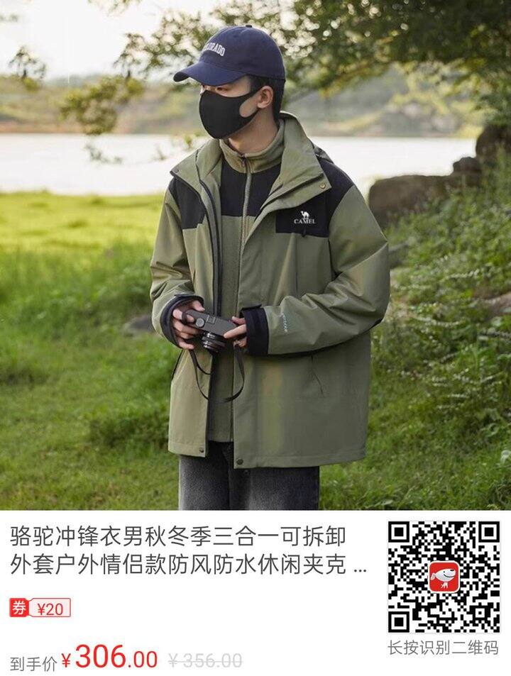 【京东】【京喜】骆驼冲锋衣男秋冬季三合一可拆卸外套户外情侣款防风防水休闲夹克 抹茶绿(三合一)男女同款 S105-120斤