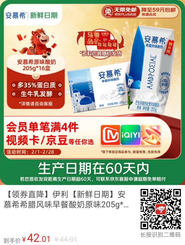 【京东】【领券直降】伊利【新鲜日期】安慕希希腊风味早餐酸奶原味205g*16盒 年货礼盒装