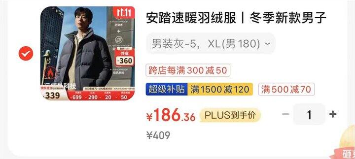 安踏速暖羽绒服,186元。
