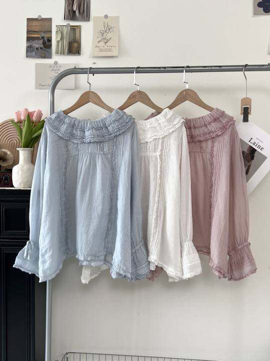 茜茜女孩夏季100苎麻两穿甜美荷叶娃娃领长袖衬衫文艺减龄小衫