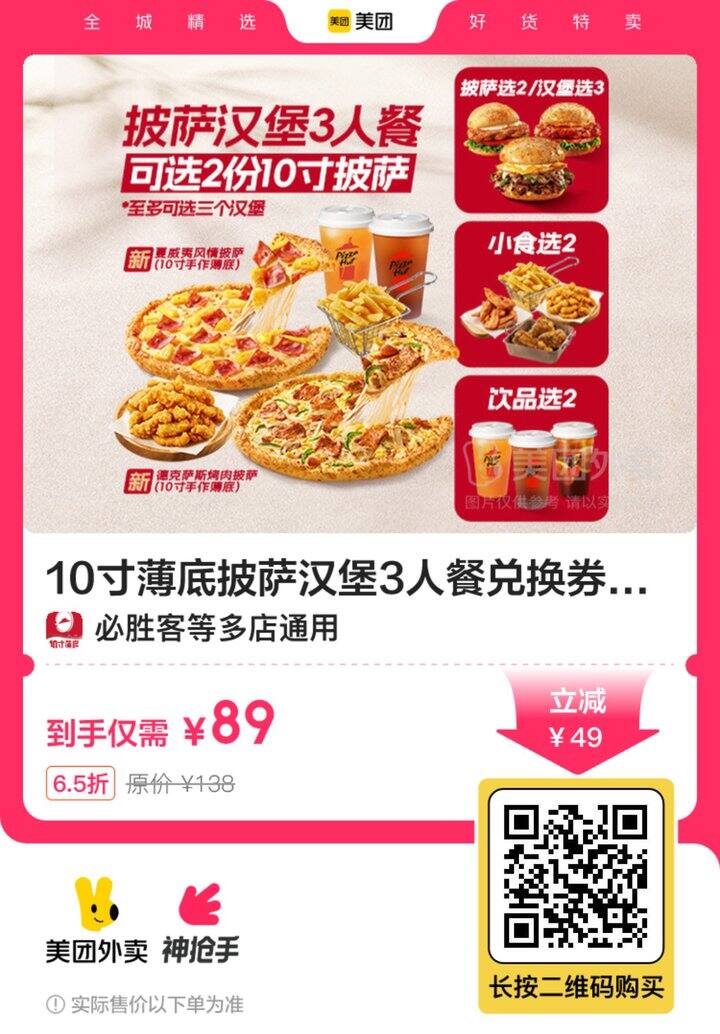 🔥【外卖】必胜客|10寸薄底披萨汉堡3人餐兑换券·1张|多店可用