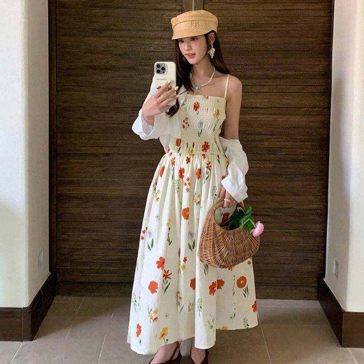 法式初恋打揽收腰印花吊带连衣裙女2025夏新款度假风气质碎花长裙