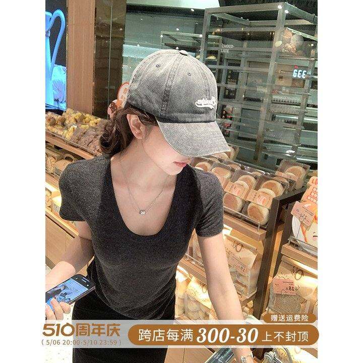 愉悦愉悦U领正肩短袖T恤女夏季纯欲性感收腰显瘦百搭薄款打底上衣