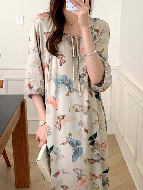 棉绸睡裙女夏季薄款绵绸睡衣清冷蝴蝶国风新中式可外穿绵绸家居裙