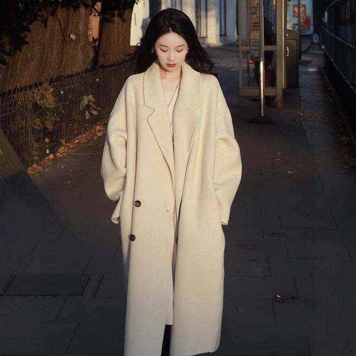 燕麦色双面羊绒大衣女中长款2024秋冬新款韩版宽松高端羊毛呢外套