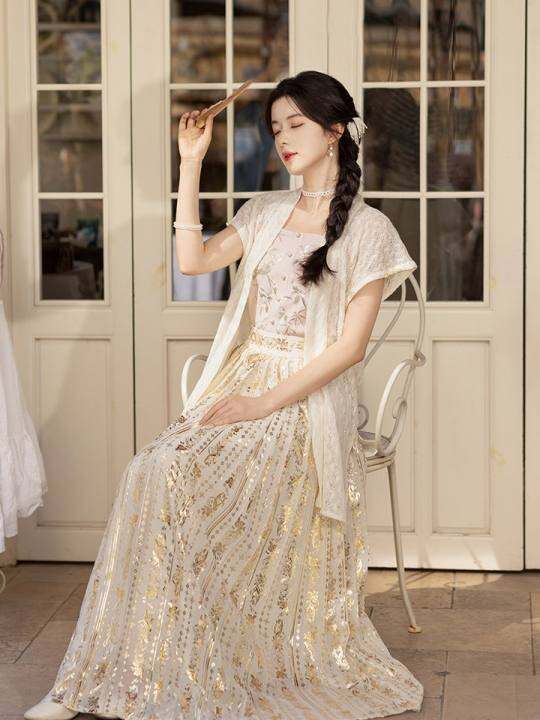池夏【立夏:漱玉听香】宋制针织背心吊带烫金褶裙原创改良汉服 夏