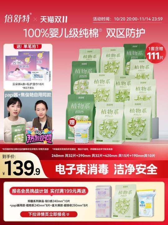 倍舒特植物系纯棉卫生巾超吸收全周期日用夜用敏感肌推荐姨妈巾