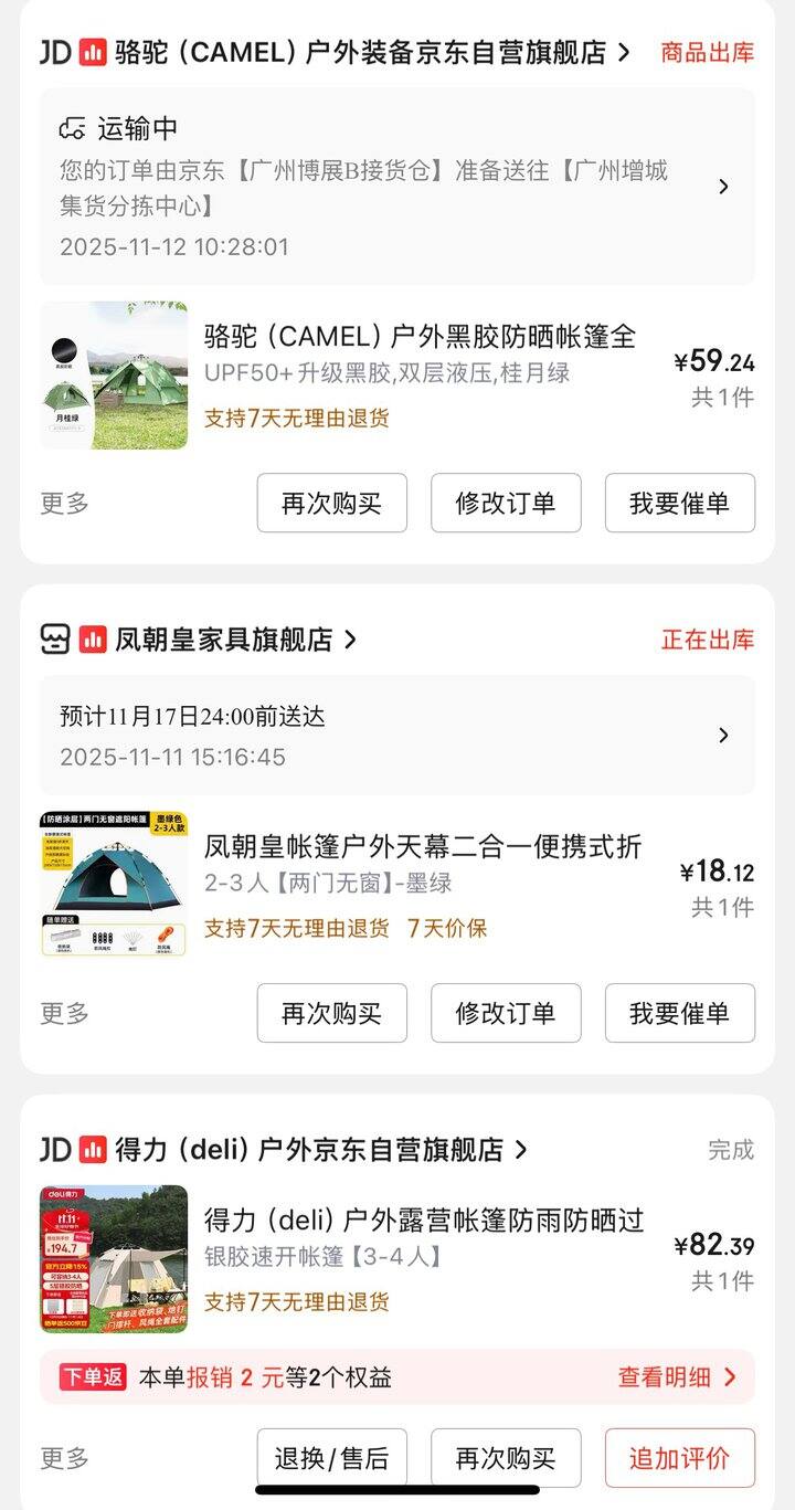 这次想着买个帐篷,没想到一次比一次便宜,一下子买了三个,到货来反馈[哭笑]
