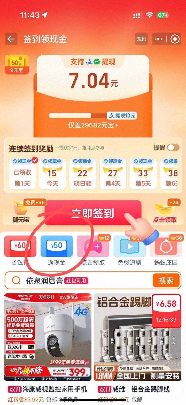 如果没有其他红包活动可以叠加的,可以试试从签到里的返现金买,每天一次机会,今天买了TP的监控,还返了30多,这是马上支付宝到账的,还可以叠加一🍑砍价。