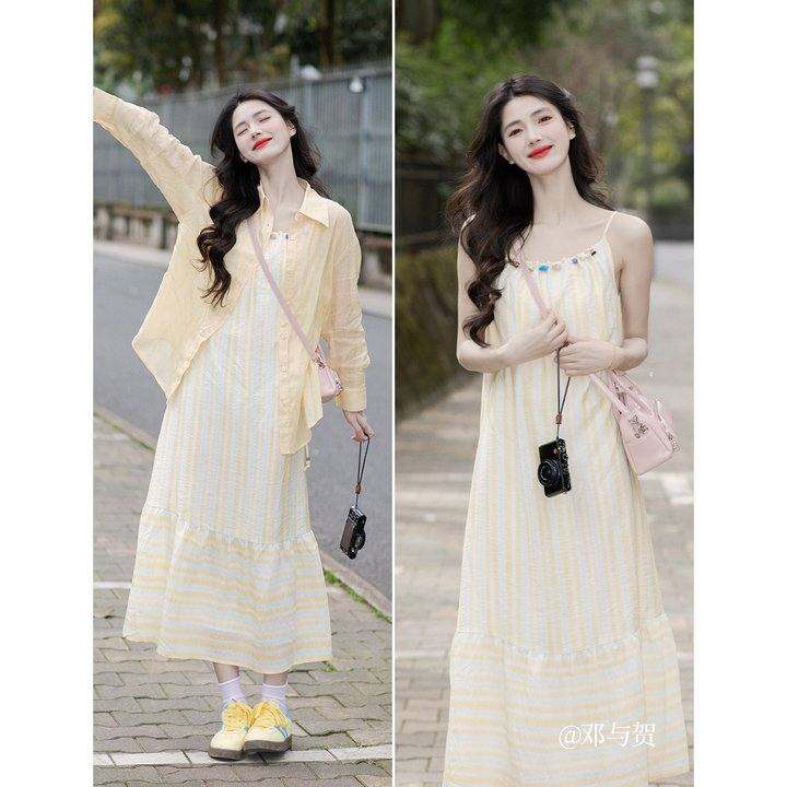 茵曼海边度假风条纹印花串珠吊带裙女2025年夏季新款长版洋装