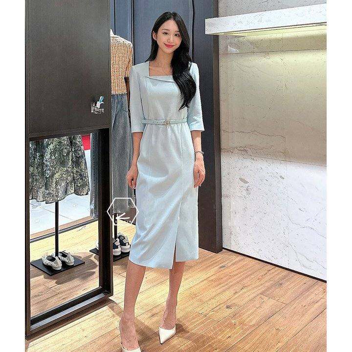 原!温柔优雅名媛 韩国25夏气质方领斜边拼接五分袖收腰开叉洋装