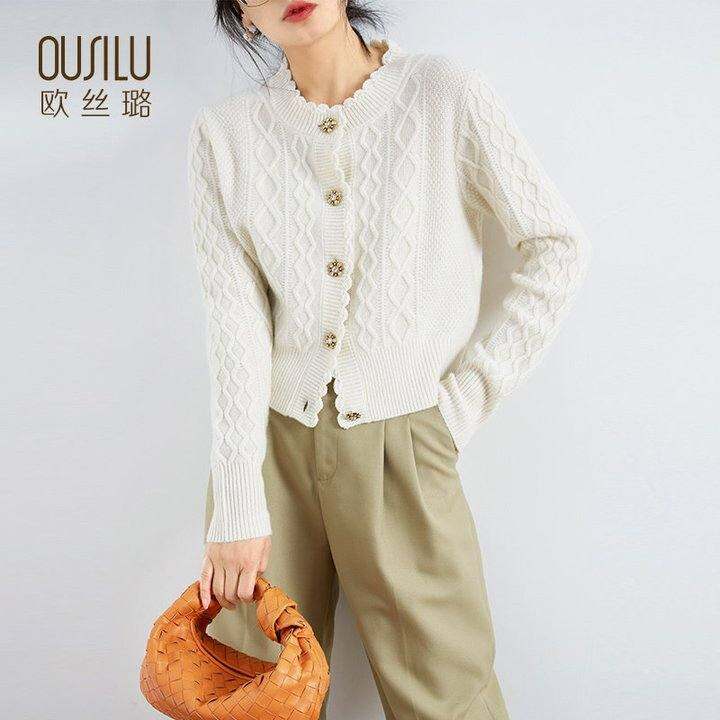 欧丝璐秋冬新款100%纯山羊绒纯色麻花不规则休闲开衫女衫毛衣