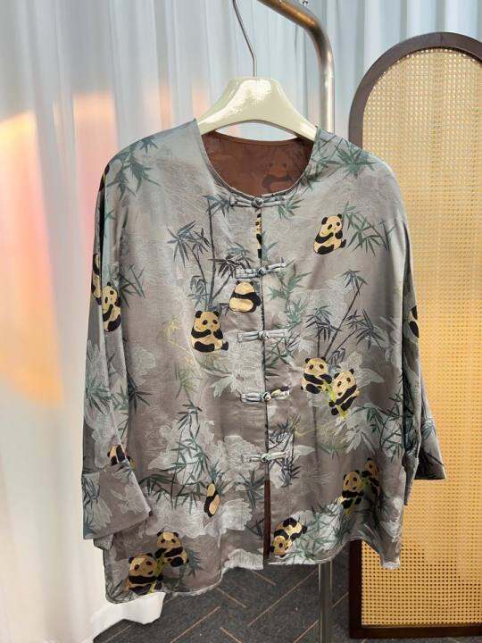26姆米灰熊猫开衫高端气质短袖新中式民族风衬衣报竹安盘扣外套