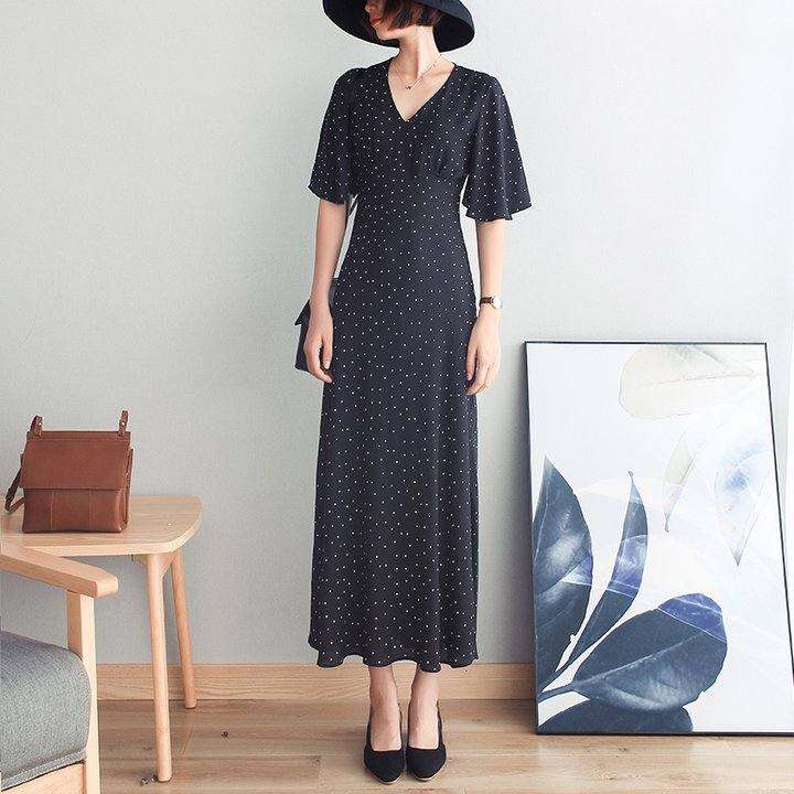 2024春夏新款女装复古简约气质波点连衣裙V领喇叭袖收腰修身长裙