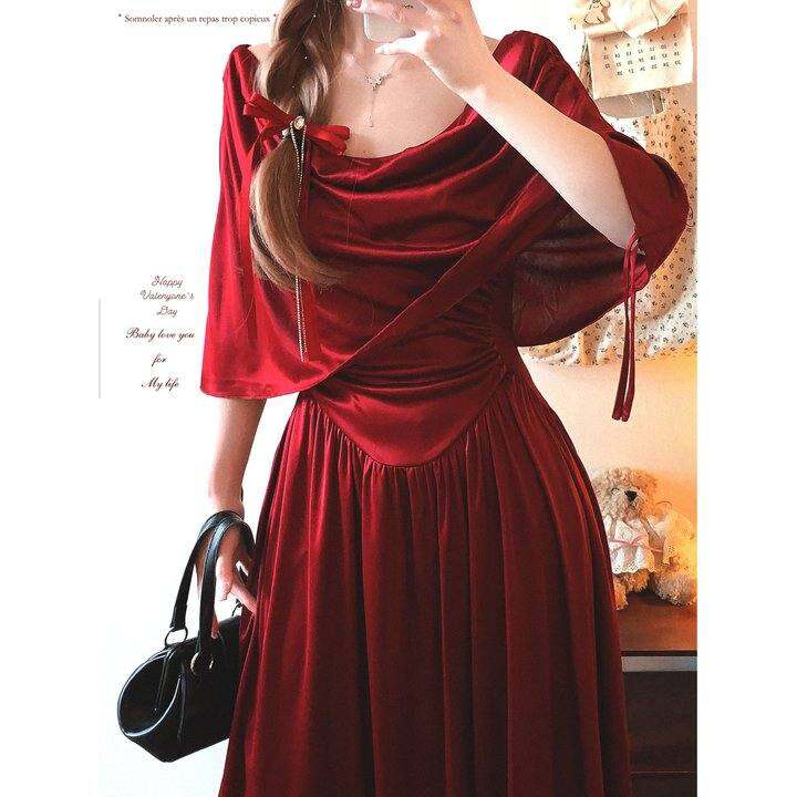 尾单 lsm 古典法式宫廷风优雅一字肩垂折领绑带缎面洋装