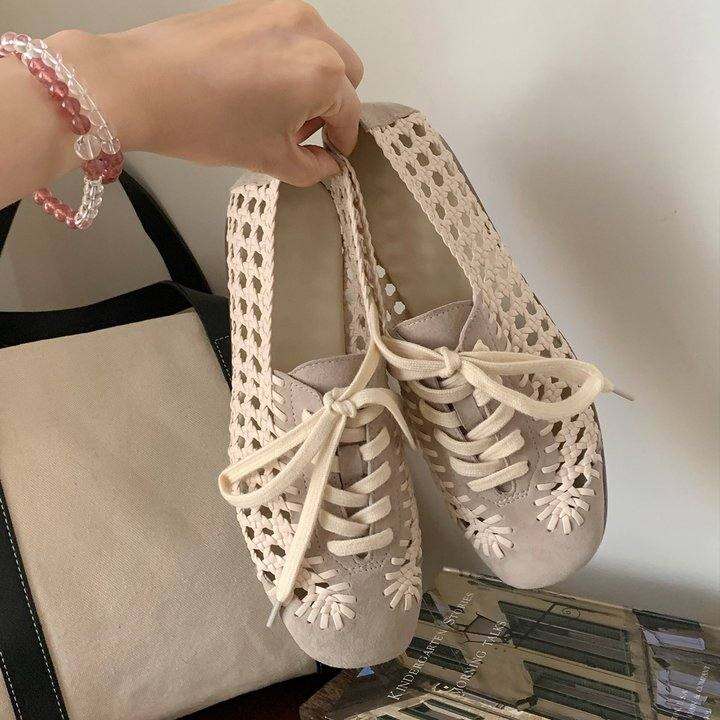 F.M编织单鞋女2025新款法式复古凉鞋镂空设计感小众平底芭蕾舞鞋