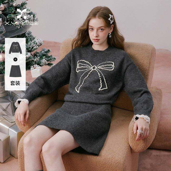 香影圣诞穿搭灰色针织套装裙女2026春装蝴蝶结毛衣短裙两件套