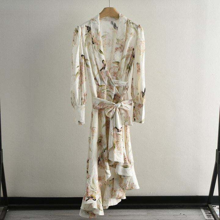 浪漫优雅风亚麻印花连衣裙女春季新款外贸女装显瘦长袖荷叶摆长裙
