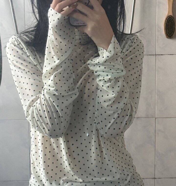 这个打底我觉得是好看的,波点是植绒的,然后微微透的绿色吧,别问我为什么双手捂在胸口,因为我是早上起来的时候试的,没穿内衣没贴胸贴[胖鹿笑哭]