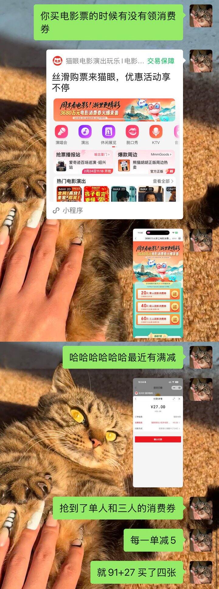 浙江的朋友们今年还是有电影消费券的噢 每天早上10点,甚至付款云闪付还能➖5,分两天抢到了单人和三人的,正好家里四个人。
