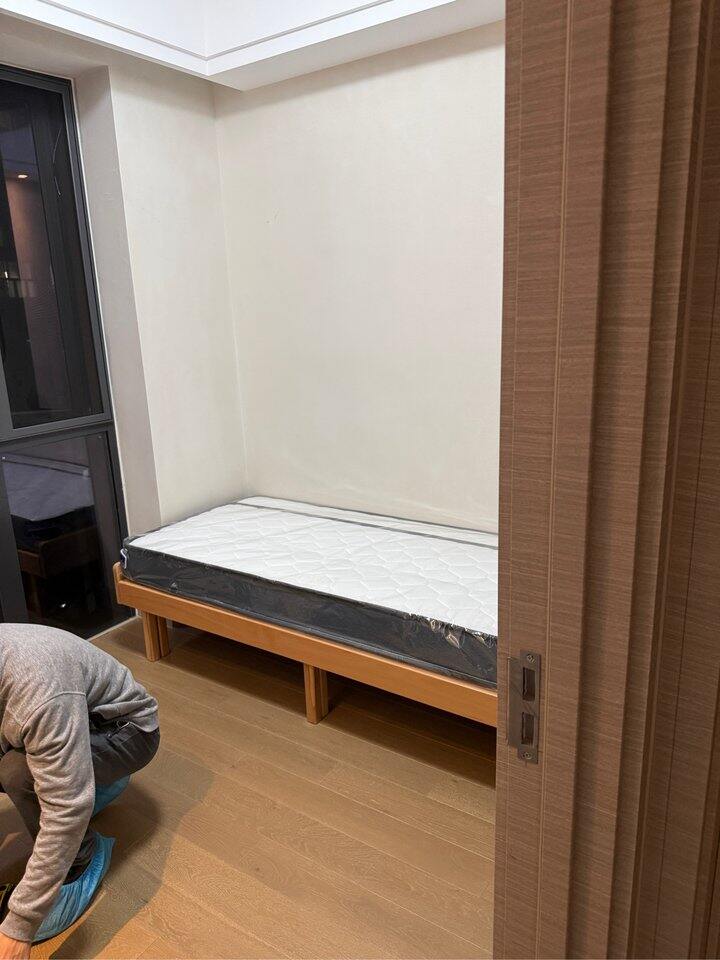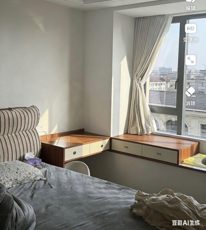 但整体还是可以的,为了把床头的插座移到侧面这边装的是下翻门,另外桌子都是抽屉和一个可以拉伸的板,这样子的话我可以坐在床上化妆