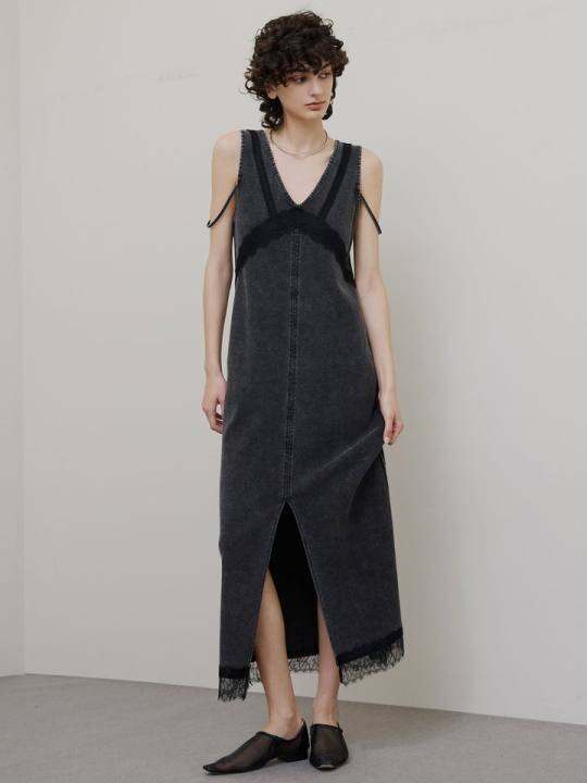 返单贵牌@meri 时髦设计感水洗做旧蕾丝拼接连衣裙长裙 25年夏