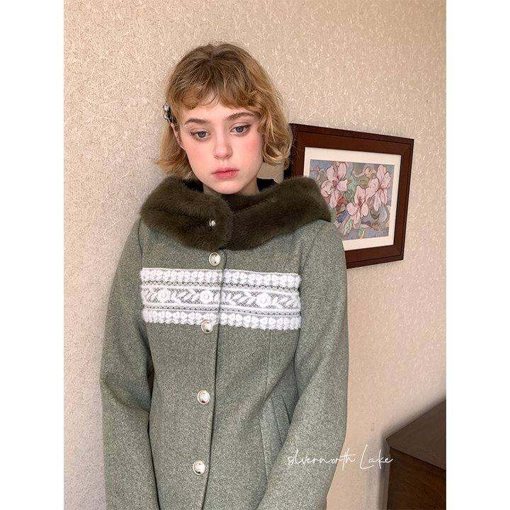 silvernorthlake银湖miu系双色蕾丝拼接毛绒围脖短款连帽毛呢外套