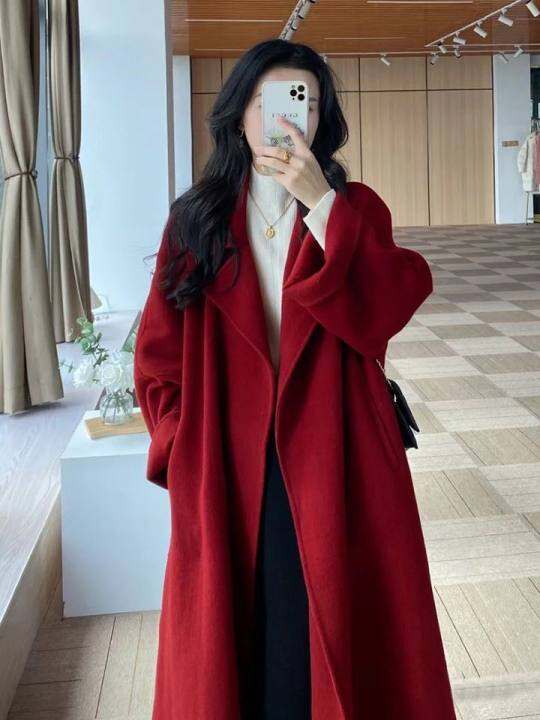 安娜家西西里双面羊绒大衣女秋冬高级感赫本风中长款红色毛呢外套